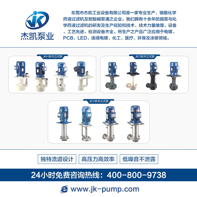 杰凱泵業專業生產,銷售化學藥液過濾機及耐酸堿泵浦.我們擁有十余年防腐泵與化學藥液過濾機的研發及生產經驗和技術,技術力量雄厚,設備,工藝先進,檢測設備齊全.所生產之產品廣泛應用于電鍍,PCB,LED,連續電鍍,化工,醫療,環保及涂裝領域.