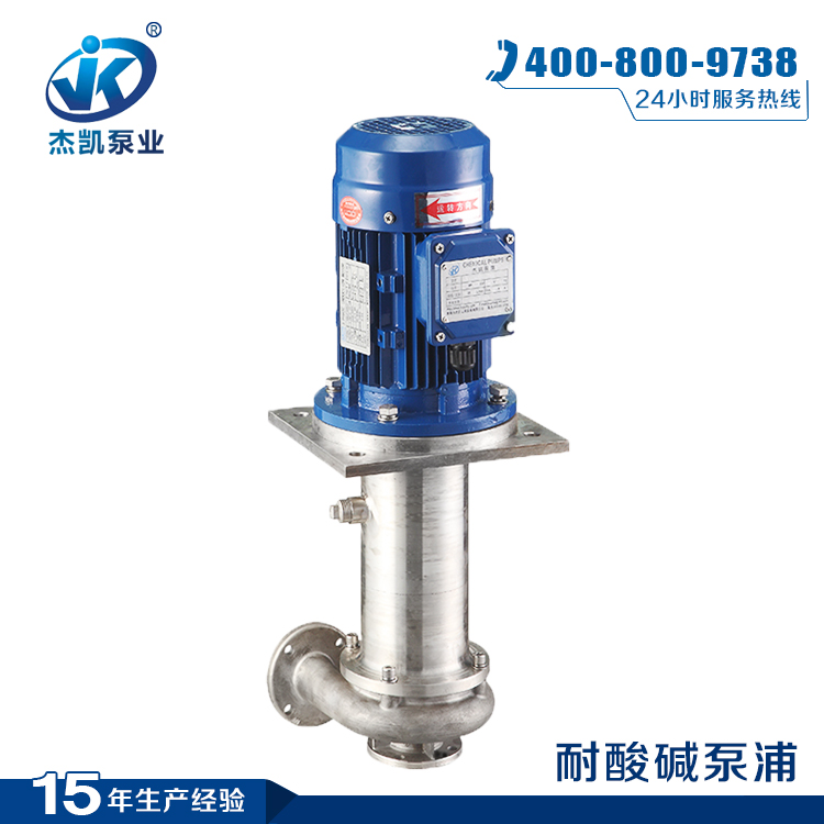 液下泵的立式電動機以螺栓固緊電機座上,并通過彈性聯軸器與泵直接傳動、泵體、中間接管、泵架、出液管、管法蘭,以螺栓聯接構成一體,固定在底板上,不銹鋼液下泵的整體通過底板安裝在容器上。液下泵的軸向力與徑向力,(包括泵運轉中所產生的水壓力,葉輪及轉子重量等),均由軸承盒內所裝單向推力球軸承,單列向心球軸承;以及滑動導軸所承受為保證泵安全正常運轉。軸承以黃油潤滑之,導軸承同所輸送的液體潤滑。因此,工作時液面必須高于葉輪中心線。伸入容器長度L的長短不同,則又分為中間導軸承結構和無中間導軸承的結構。新型液下泵的結構是泵與電機連接為一體潛入液下,實現將物料準確送達目標儲的目的。