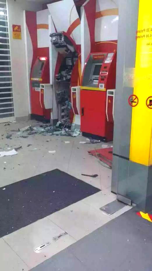 馬來西亞在當地時間13日凌晨2時許,約四名匪徒乘坐一輛豪華汽車抵達馬六甲一家銀行現場,將兩枚土制炸彈放在愛極樂高原大馬銀行電子銀行室內,其中一顆炸彈炸開提款機,雖然一地都是鈔票,但只抓了一把鈔票就逃。盜走一筆數額未明的款項。