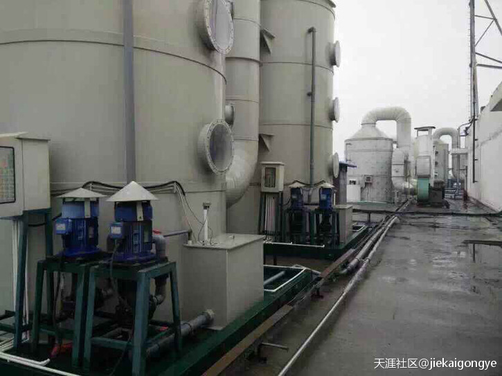 廢氣洗滌塔,也叫酸霧凈化塔,廢氣經由填充式洗滌塔,采用氣液逆向吸收方式處理,即液體自塔頂向下以霧狀(或小液滴)噴撒而下。廢氣則由塔體(逆向流)達到氣液接觸之目的。此處理方式,可冷卻廢氣、調理氣體及去除顆粒,再經過除霧段處理后,排入大氣中。