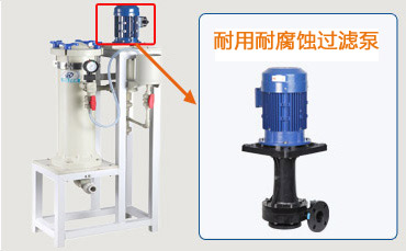 杰凱化學鎳過濾機JKC系列使用的泵浦是非常耐腐蝕立式泵,具備較強的耐腐蝕性,能適合各種酸堿藥液循環過濾;泵浦設計、材質、以及工藝上也是精益求精,做到不僅防腐而且更耐用,有效提高了過濾機的使用壽命。