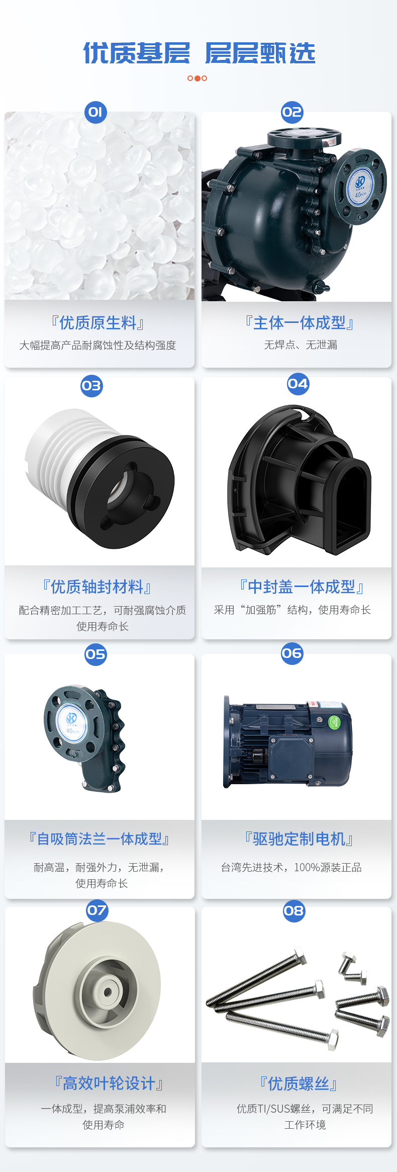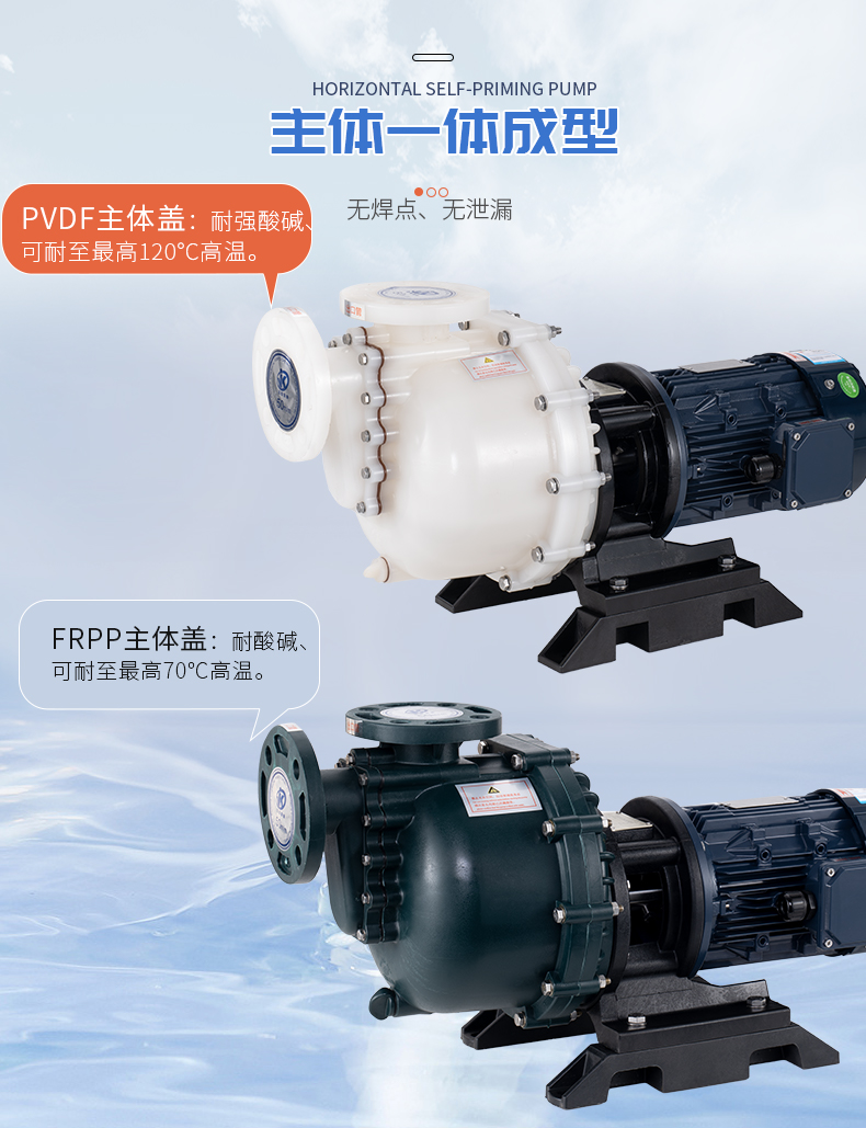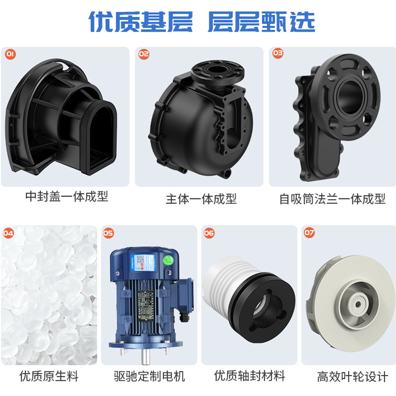 1、泵體采用優質原生料,大幅提高產品耐腐蝕性及結構強度; 2、自吸筒與法蘭一體成型,無焊點,無泄漏; 3、中封蓋一體成型,采用強筋穩固,使用壽命長; 4、高效葉輪設計,一體成型,提高泵浦效率和使用壽命; 5、軸封材質可配合使用環境選擇不同材質。