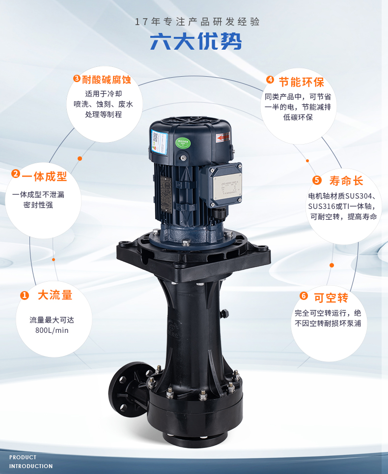1、采用進口/上市企業優質原生料,大幅提高產品強度及耐腐蝕性; 2、特制的桿式軸封,配合SUS金屬或TI金屬一體軸,可耐空轉、防腐蝕,提高電機壽命; 3、創新型葉輪設計,一體成型工藝,效率高、性能穩定、壽命長; 4、獨特的反葉輪設計,減少水力損失,杜絕泄漏; 5、完全可空轉運行,絕不因空轉而損壞泵浦; 6、適合各種酸堿液體循環,適用于冷卻、噴洗、蝕刻、廢水處理等制程。