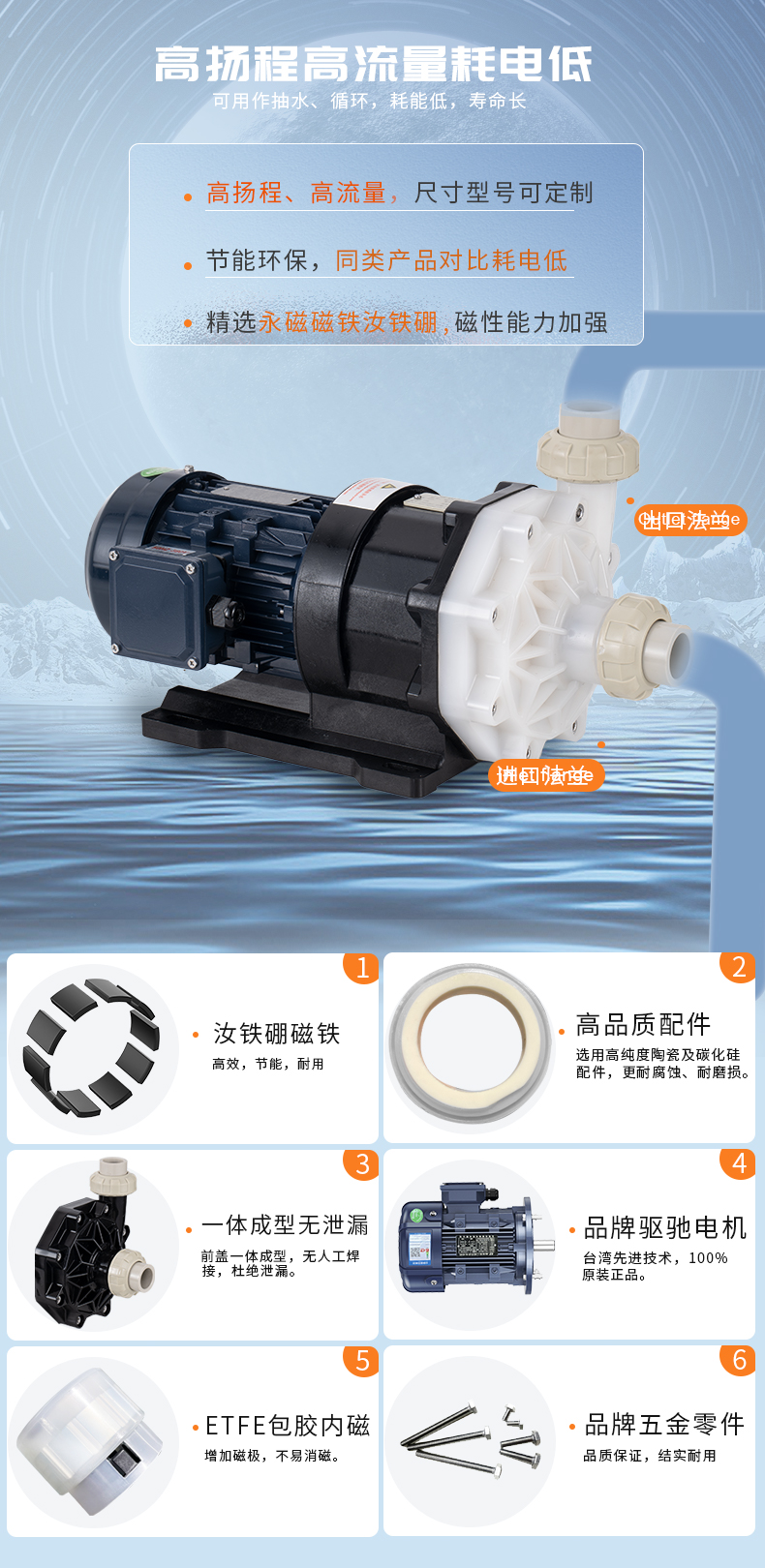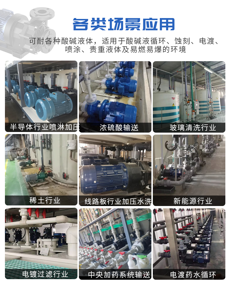 1、泵浦采用優質CFRPP/PVDF/ETFE原生材料; 2、高純度陶瓷及碳化硅軸承、軸芯; 3、耐腐蝕、耐磨損、耐熱沖擊; 4、超大流量,流量可達1100L/MIN; 適用于:蝕刻液、電鍍液、電泳液、污水提升、輸送、噴淋等。