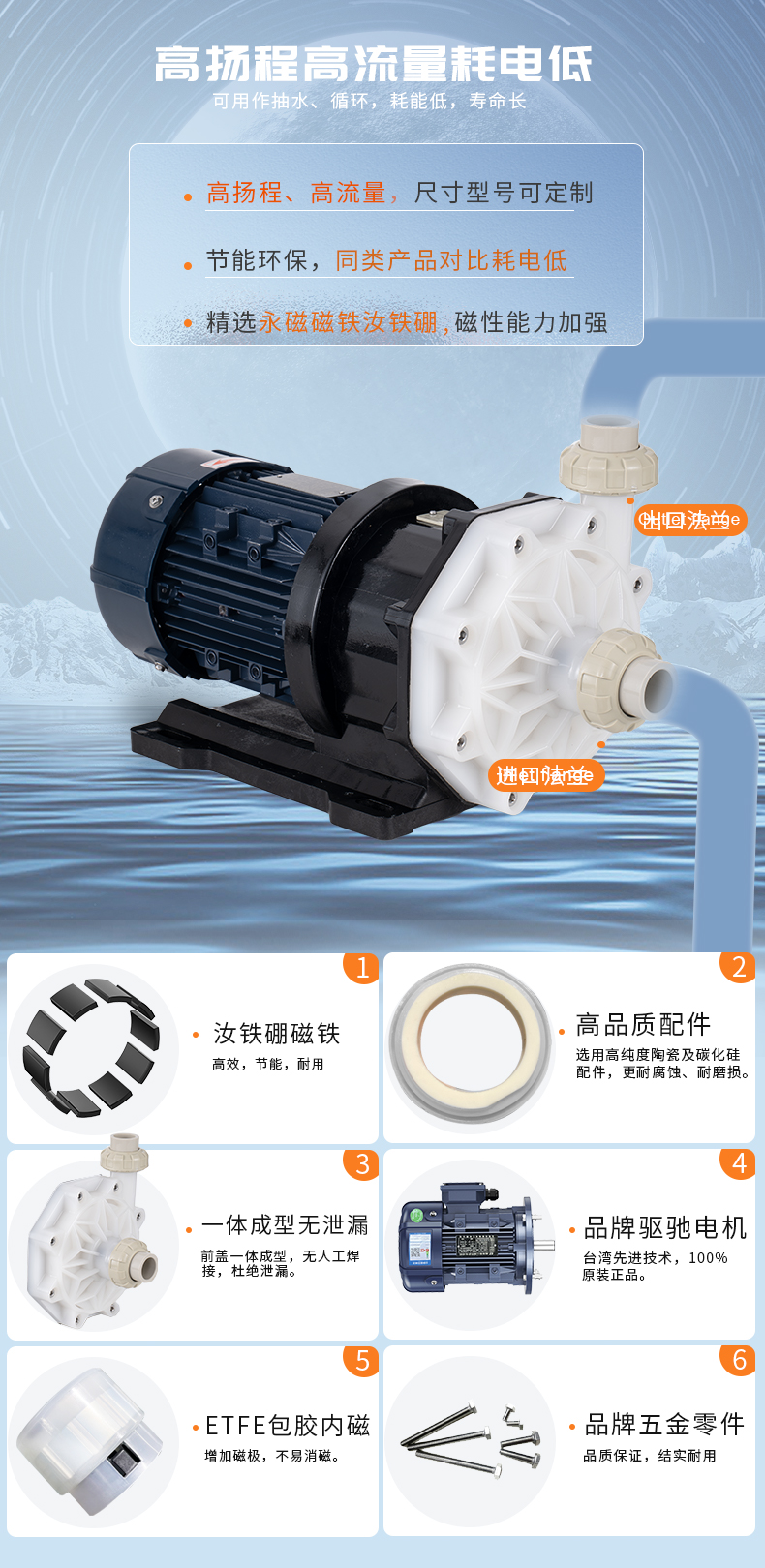 1、泵浦采用優(yōu)質CFRPP/PVDF/ETFE原生材料; 2、高純度陶瓷及碳化硅軸承、軸芯; 3、耐腐蝕、耐磨損、耐熱沖擊; 4、超大流量,流量可達1100L/MIN; 適用于:蝕刻液、電鍍液、電泳液、污水提升、輸送、噴淋等。
