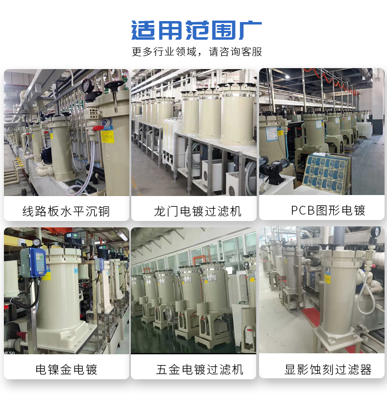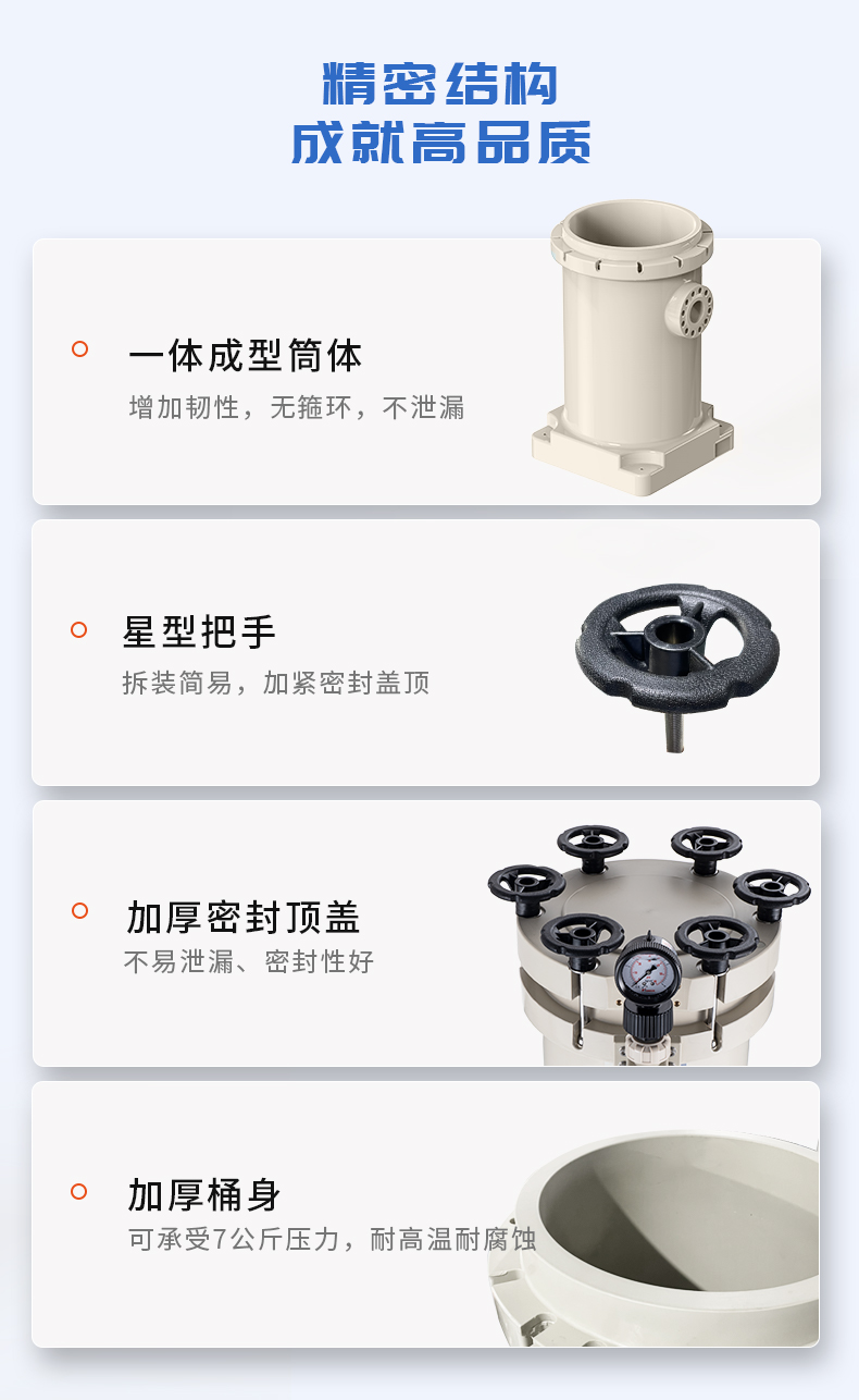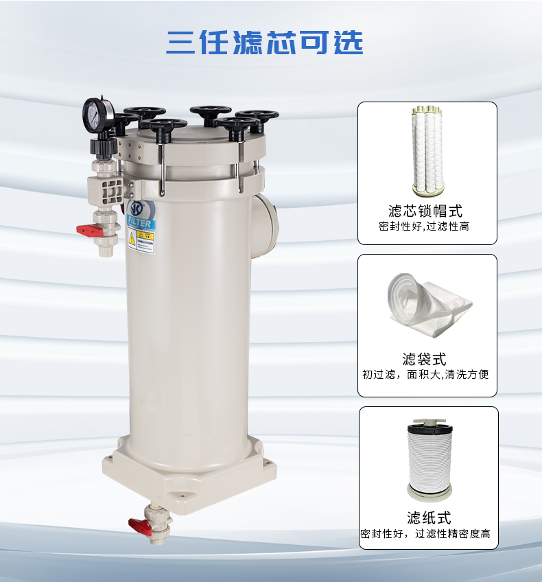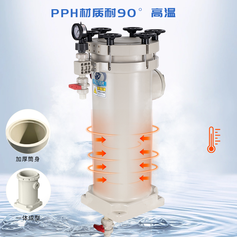 1、PPH/PVDF 原生材料,多種濾材可選; 2、桶身排氣,無金屬扣環+翻蓋設計; 3、加厚桶一體成型設計,整機無焊接點,100%無泄漏,結實、安全。使用壽命可達8-10 年; 4、配套多種款式濾材,滿足市場多種需求; 5、廣泛用于酸堿藥水,電鍍藥水,蝕刻液,清洗液過濾。