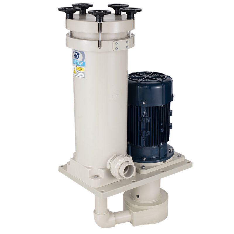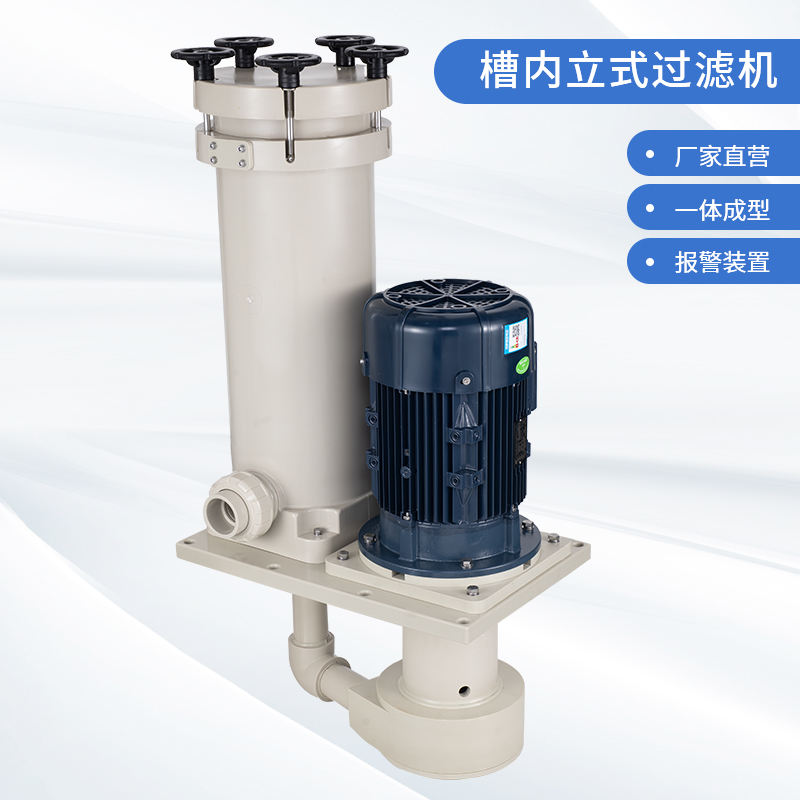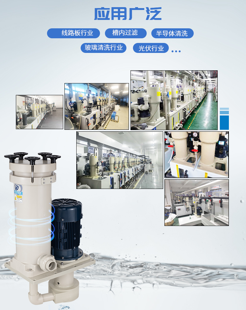 1、采用優質PPH/PVDF優質原材料,提升耐腐蝕能性及結構強度; 2、泵與過濾器一體配套,緊湊,占用空間小,為客戶整線設計釋放空間及降低成本; 3、槽內安裝,可配套濾芯,濾袋,網板多種方式,適用于噴淋、循環等制程; 4、更換濾芯快捷、省時,省力; 5、獨特的報警裝置設計,開蓋更安全。